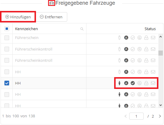 Um die Fahrzeuge eines Benutzers anzuzeigen, klicken Sie auf den - Button.