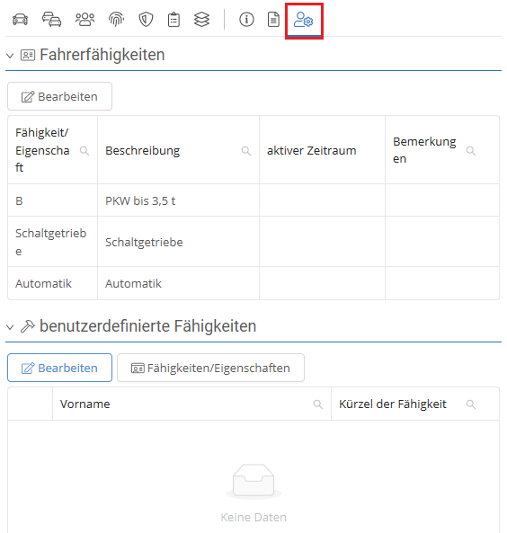 Im Reiter der Fahrerfähigkeiten können Sie sehen, welche Fähigkeiten für den ausgewählten Benutzer eingetragen sind. Durch einen Klick auf den - Button können Sie dem Benutzer weitere Fähigkeiten zuordnen oder entfernen.