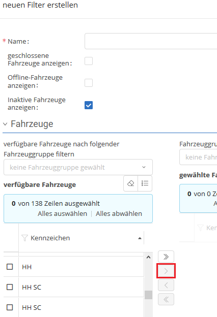 - Button, erstellen Sie einen neuen Filter. Sie müssen dem neuen Filter einen Namen geben (Pflichtfeld). Des weiteren haben Sie die Möglichkeit, verschiedene Fahrzeugarten auszuwählen und bestimmte Fahrzeuge dem Filter hinzuzufügen.