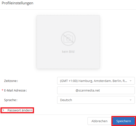 haben Sie die Möglichkeit ein Profilbild hinzuzufügen, die E-Mail Adresse zu ändern und die Sprache zu wechseln. Zusätzlich können Sie hier Ihr Passwort ändern. Mit einem Klick auf