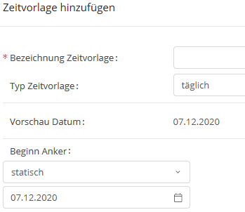 können Sie eine weitere Zeitvorlage hinzufügen. Dort müssen Sie die neue Zeitvorlage benennen (Pflichtfeld) und können die Angaben nach Ihrem Belieben eingeben.