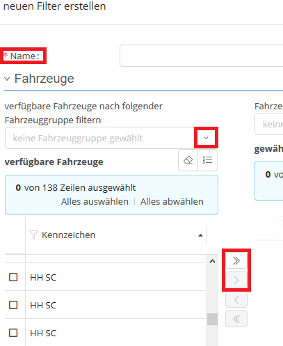 Anschließend öffnet sich ein neues Fenster, wo ein Name für den Filter vergeben werden muss (Pflichtfeld). Nun können Sie einzelne Fahrzeuge oder bereits erstellte Fahrzeuggruppen auswählen und über den - Button in die Liste der ausgewählten Fahrzeuge verschieben. Zuletzt können Sie den angelegten Filter über den
