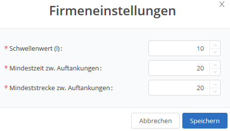 Hier können Sie Ihre Richtwerte für einen Tankvorgang und die Abstände zwischen zwei Tankvorgängen eingeben.