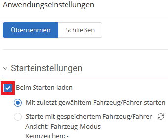 In dem sich öffnenden Einstellungsmenü können Sie unter Starteinstellungen das Feld Beim Starten laden mit einem Haken versehen und anschließend weitere Einstellungen vornehmen. Um Ihre Einstellungen zu speichern, klicken Sie auf .