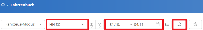 Wählen Sie Ihr Fahrzeug aus dem Dropdown-Menü aus und bestimmen Sie den Zeitraum, für den Sie Ihr Fahrtenbuch anzeigen lassen wollen. Sie können hierzu über das - Symbol den Kalender öffnen und den gewünschten Zeitraum markieren oder über das