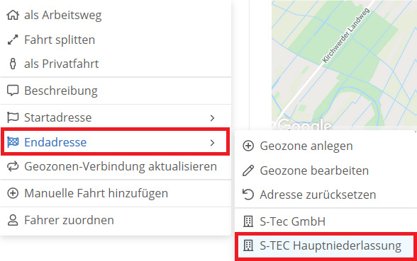 Wenn mit einem Start- oder Endpunkt mehrere Geozonen verknüpft sind, wird der jeweilige Ort mit zwei grauen Punkten in der Fahrtenbuchtabelle angezeigt. Klicken Sie mit der rechten Maustaste auf die Fahrt, wählen Sie „Startadresse“ oder „Endadresse“ und suchen Sie die gewünschte Geozone aus dem Menü aus.
