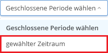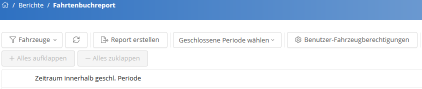 Es werden Ihnen nun die geschlossenen Perioden der ausgewählten Fahrzeuge angezeigt. Sie haben nun die Möglichkeit, einen Report für eine geschlossene Periode zu erstellen oder einen Report für einen Zeitraum. Um einen Zeitraum zu wählen, klicken Sie auf den - Button und wählen gewählter Zeitraum aus dem Dropdown-Menü aus. Der maximale Zeitraum, der zusammengefasst werden kann, beträgt ein Jahr.
