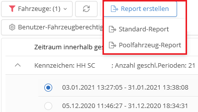 Wenn Sie die für Sie passende Periode gefunden haben, wählen Sie diese aus und klicken auf den - Button. Anschließend haben Sie die Wahl, einen Standard- oder einen Poolfahrzeug-Report zu erstellen. Der Poolfahrzeug-Report wird zusätzlich nach Fahrern unterteilt.