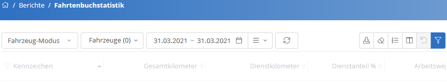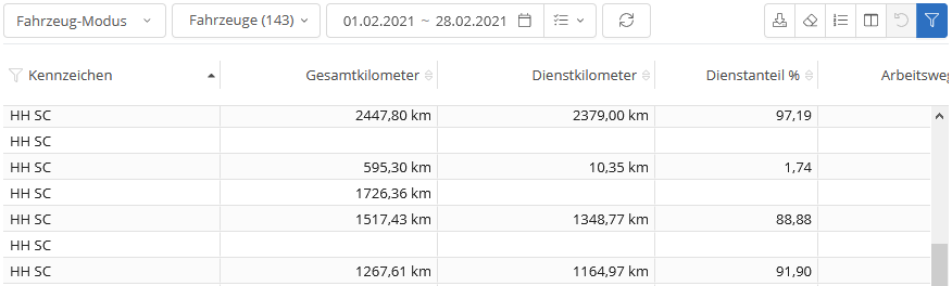 Nun werden die ausgewählten Fahrzeuge tabellarisch mit den dazugehörigen Kilometern dargestellt.
