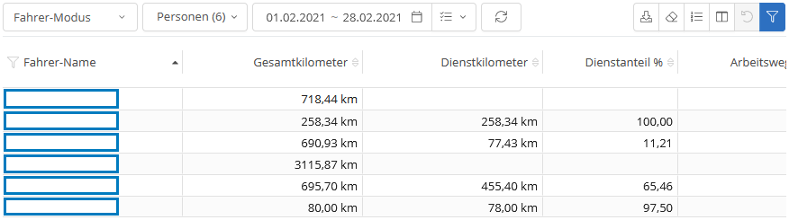 Nun werden die ausgewählten Personen tabellarisch mit den dazugehörigen Kilometern dargestellt.