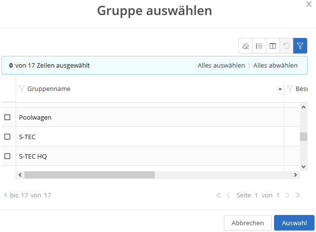 Anschließend können Sie eine Fahrzeuggruppe aus der Liste auswählen und die Auswahl mit dem - Button bestätigen.