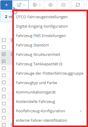Wenn Sie den Multi-Auswahlmodus aktiviert haben (s. Tabellenfunktionsleiste), können Sie bestimmte Angaben für mehrere Fahrzeuge gleichzeitig bearbeiten. Wählen Sie hierzu die Fahrzeuge aus, klicken Sie auf den - Button in der Hauptfunktionsleiste und wählen Sie anschließend aus dem Dropdown-Menü die Datenkategorie aus, die Sie bearbeiten möchten.