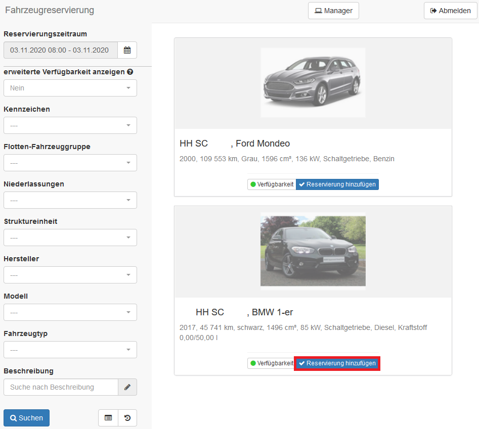 Im Bereich der Fahrzeugreservierung können Sie in einem auszuwählenden Reservierungszeitraum nach verfügbaren Fahrzeugen suchen. Die Ergebnisse können Sie durch detailliertere Angaben, wie z.B. Hersteller, Filtern.
