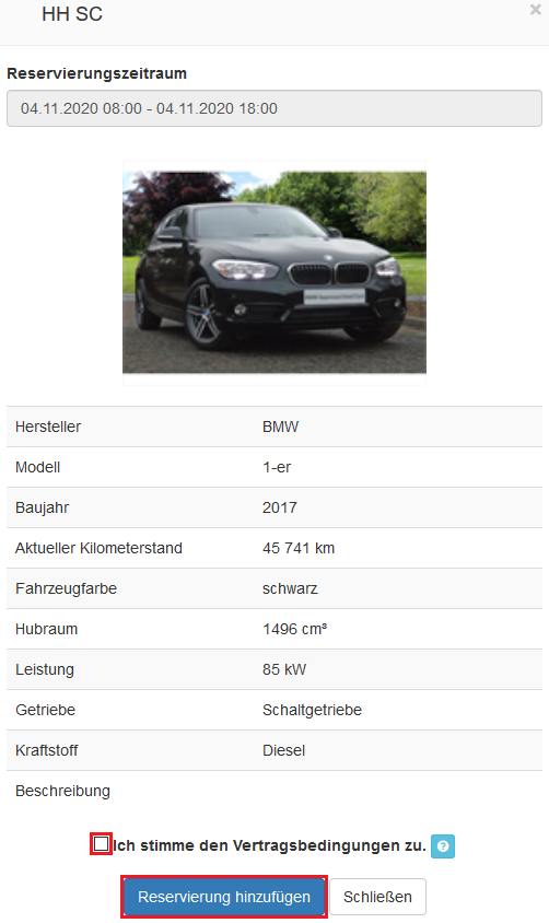 Mit einem Klick auf die Fahrzeugreservierung öffnet sich ein neues Fenster.