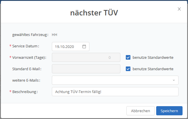 Unter dem Reiter der Fahrzeugbearbeitung haben Sie den Unterpunkt Inspektion. Hier ist es Ihnen möglich, Erinnerungen für Termine, wie den nächsten TÜV, zu erstellen.
