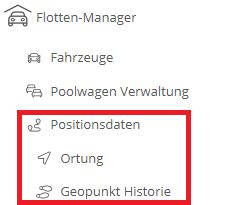 Flotten-Manager Die Positionsdaten Im Menü der Positionsdatenverwaltung haben Sie die Möglichkeit, Ihre Fahrzeuge auf der Karte anzeigen zu lassen und Ihre Geopunkte zu verwalten. Folgende Daten stehen Ihnen zur Verfügung: Ortung Geopunkt Historie