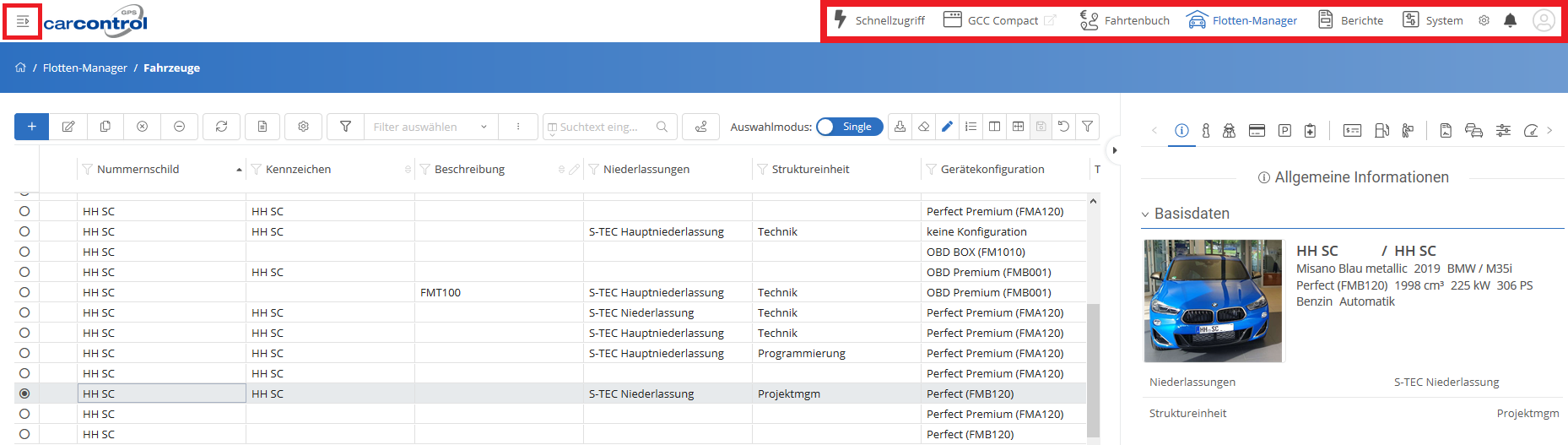 Die zweite Möglichkeit, die Unterpunkte zu öffnen besteht darin, diesen Button zu klicken. Dieser befindet sich oben links neben dem CarControl Logo. Anschließend können Sie auf alle Unterpunkte zugreifen.