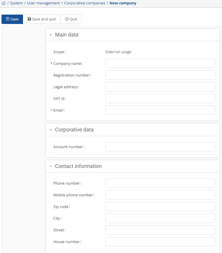 In this section, you can add companies with all important data to the system. To do this, press the