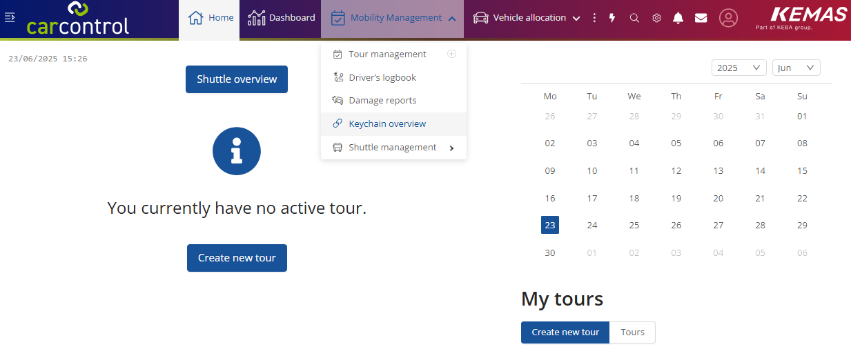 To view the digital keychain, click on Mobility management in the menu bar and on Keychain overview in the drop-down menu.