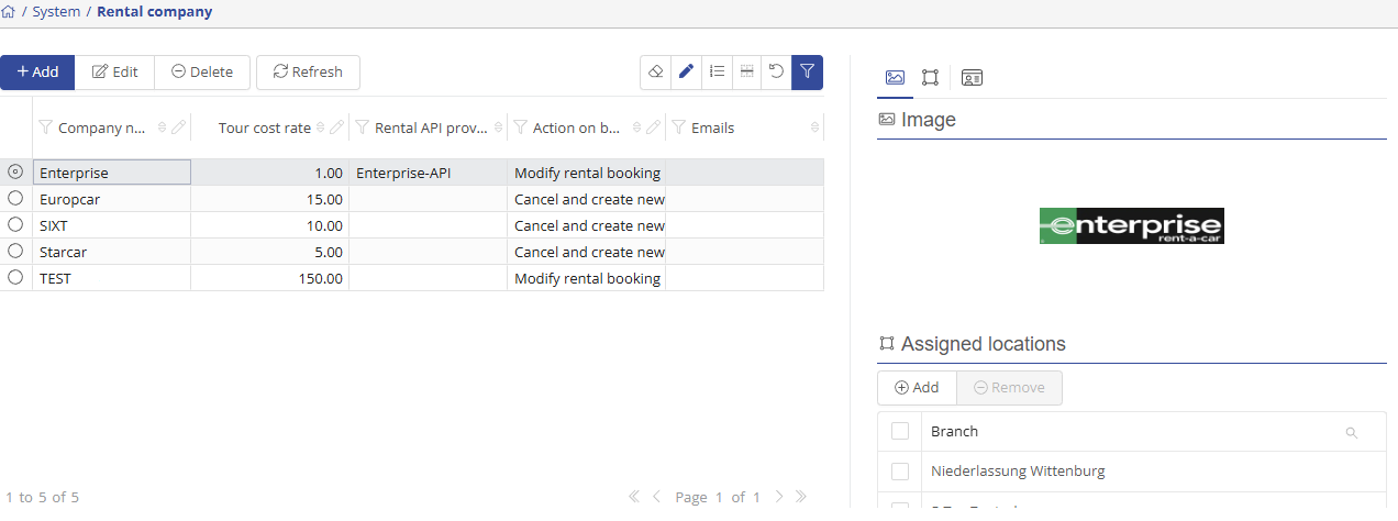 On the left side of the window, you will see all rental companies stored in the system. On the right side, you will see the image and the linked locations of the rental company.