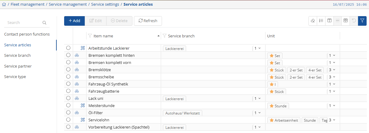 Under “Service articles” you can view and manage your stored articles. You can