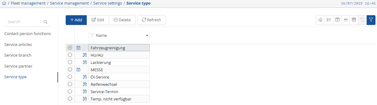 Under “Service type” you can view and manage your stored types. You can add to them at any time using