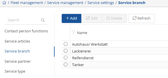 In the service partner sector settings, you can add service partner branch and rename existing ones.