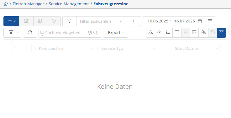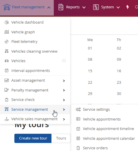 The Service Management view and settings can be found on the start page under Fleet Manager and the drop-down menu below.