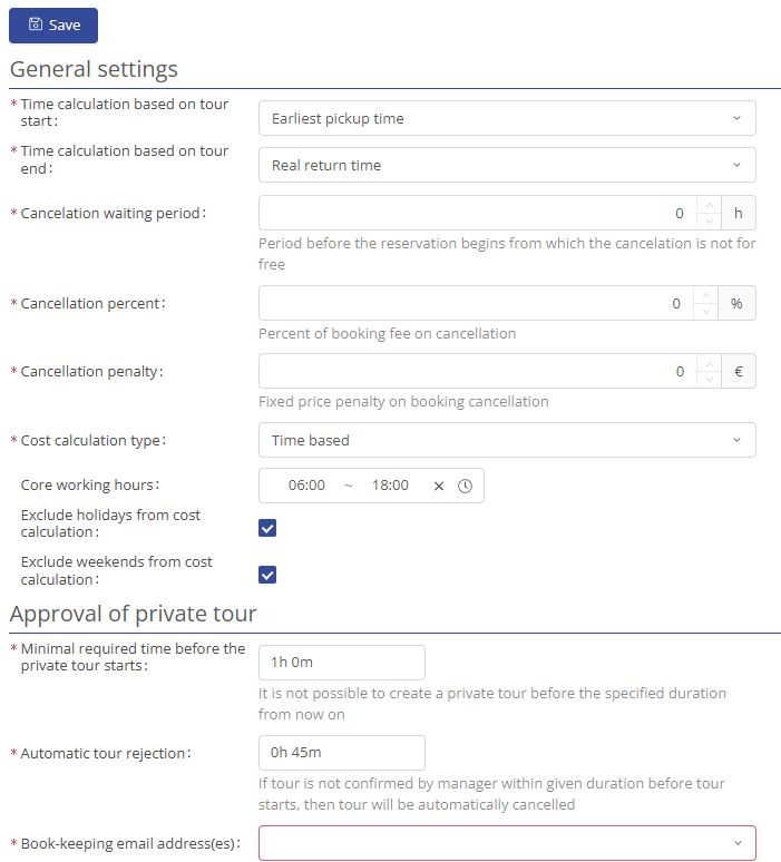 This is where you can store the most important settings for your system. These settings will be configured and stored together with you during the training session. For your system to work, the fields marked with an asterisk (*) must be filled in and saved. Here you can specify the earliest time at which the car will be ready for collection and the return time. The cancellation waiting period can be set as required, as can the cancellation percent and cancellation penalty. The same applies to the type of cost calculations type.