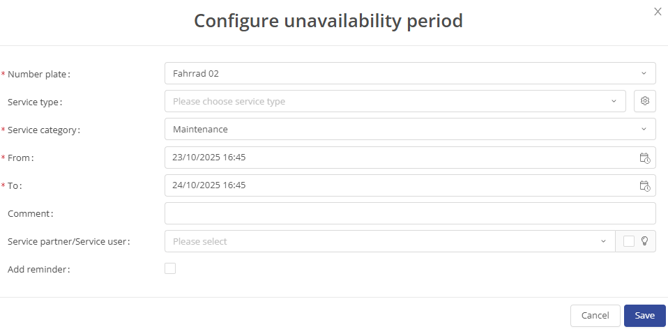 When you enter an appointment for the workshop or maintenance, a window similar to the driver/vehicle assignment opens. However, here you only need to enter when the vehicle is not available for use. You must then click on