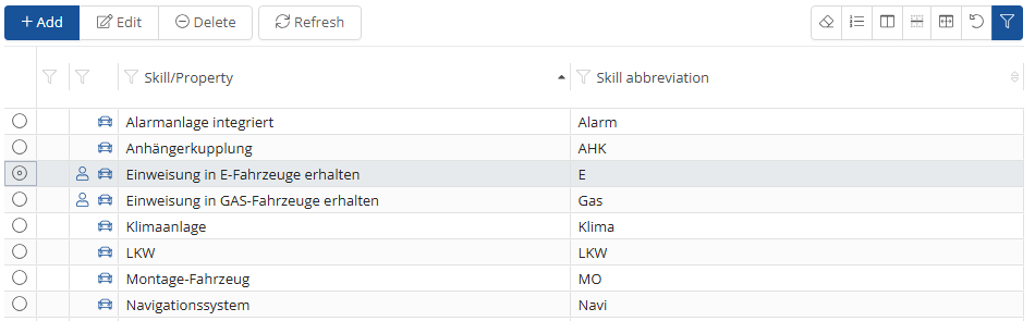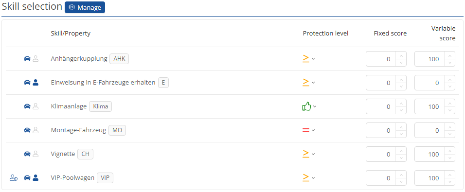 In the skills selection, you have the same options as in the general requirements, except that these are the skills that a driver must have in order to book a vehicle/ for it to be displayed in the search.