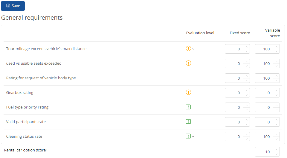 In order for a rental car to be displayed, you can specify how many points it must achieve in the search in the Car rental option score field.