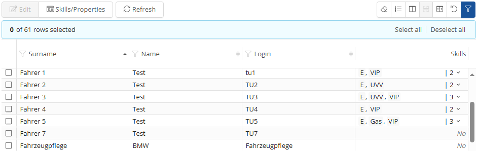 All registered drivers can be displayed here, along with their specific driving skills. You can also filter