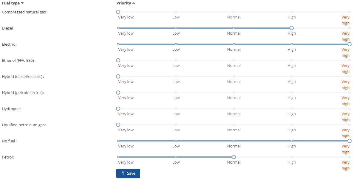Under the Fuel type priority item, you can specify the priority with which the vehicles are allocated to the drivers.