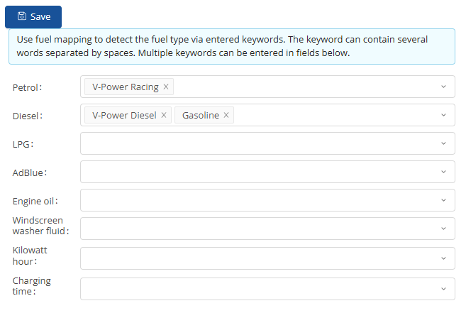 Additional fuel type assignments can be entered and saved