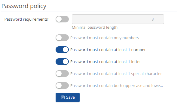 Here you can set how secure and what characteristics the user passwords should have and
