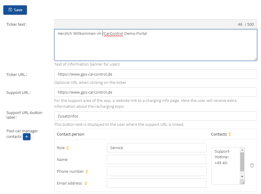 Under the Settings tab, you can make all possible settings for the Corporate and Public Carsharing system.