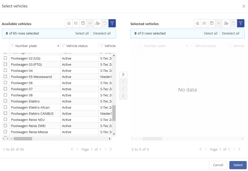 In the list that opens, you can click on the vehicles you wish to select. Selected vehicles are marked with a tick. You can then use the arrows to add or remove the selected vehicles from the selection. Confirm your selection by clicking on the