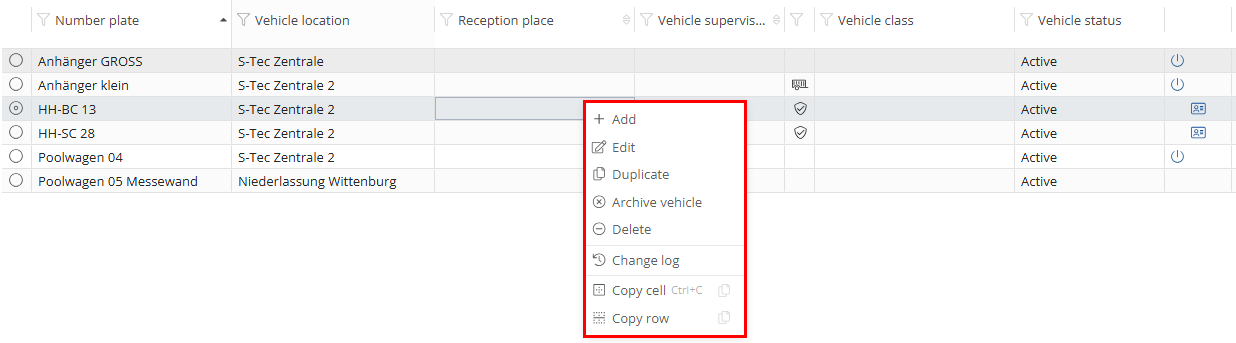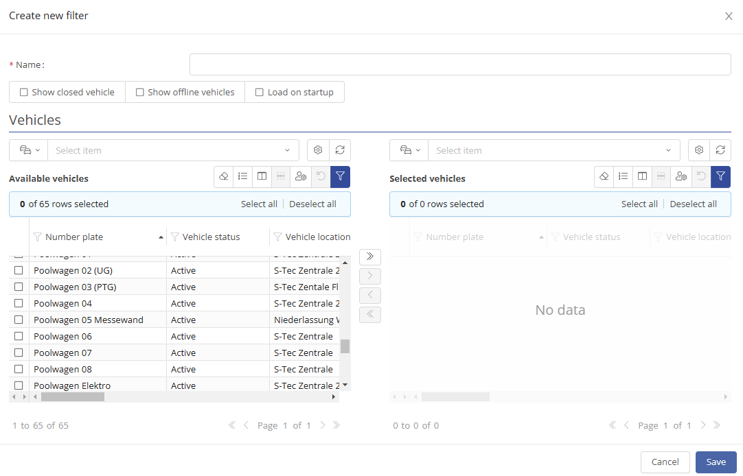 In the view that opens, you will see a table. This shows which vehicles are displayed under the respective filters (archived/closed, offline or inactive). You can add, edit or delete filters using the function bar.