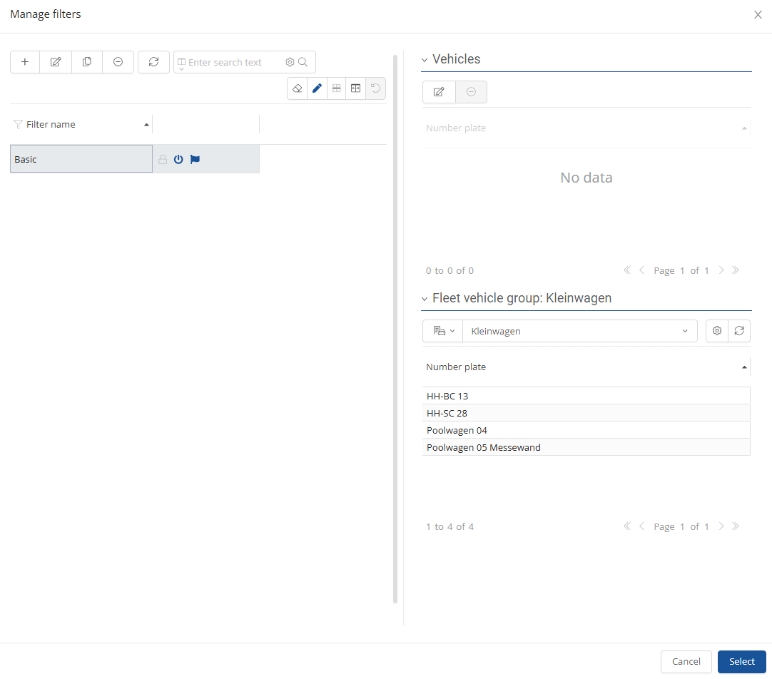 The individual vehicles or vehicle groups included in the filter can be edited using the