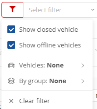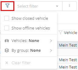 If you click on the filter icon in the main toolbar, you can select from the drop-down menu whether closed and offline vehicles should be displayed. To do this, place a tick in the corresponding field. You can also select specific vehicles or a vehicle group here.