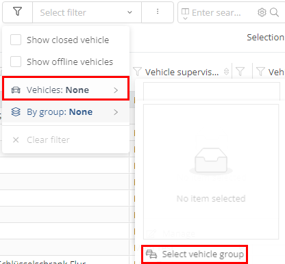 To select a vehicle group, click on Vehicle group: None and then click Select vehicle group. In the window that opens, you can then select the desired vehicle group from the drop-down menu. Vehicle groups must first be created in the system.