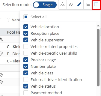 In "Single" selection mode, you can only select one vehicle at a time in the table by clicking anywhere in the row of the vehicle. The selected vehicle is highlighted in gray and marked in the selection column on the left-hand side.