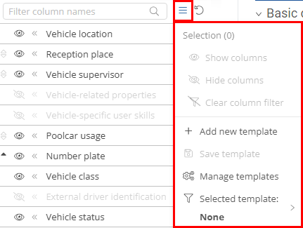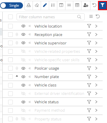 By selecting or deselecting the column names, you can decide whether the columns should be displayed or hidden. The column filter can also be cleared.