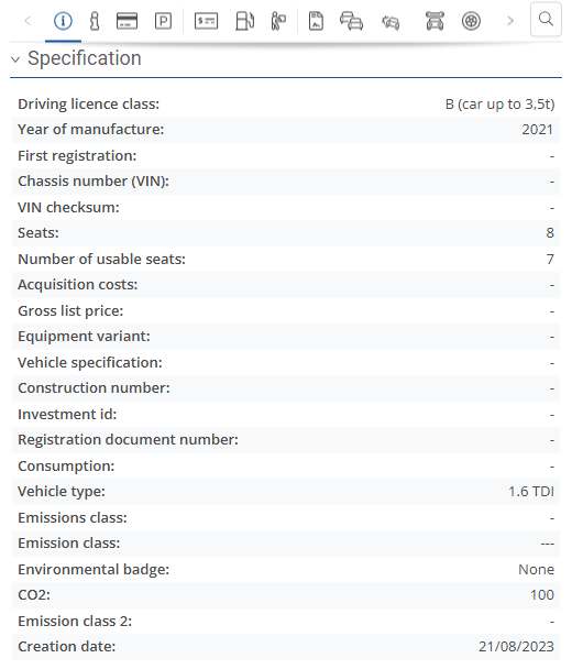 Under Specification you can see all the vehicle data, from the required driving license category to the purchase price and fuel consumption.