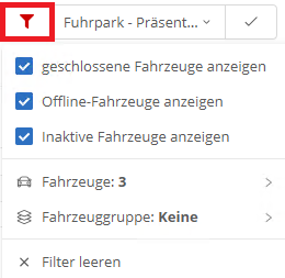 Wenn Sie auf das Filter-Symbol in der Hauptfunktionsleiste klicken, können Sie im Dropdown-Menü auswählen, ob geschlossene, inaktive und Offline-Fahrzeuge angezeigt werden sollen. Setzen Sie dazu ein Häkchen in das entsprechende Feld. Zusätzlich können Sie hier bestimmte Fahrzeuge oder eine Fahrzeuggruppe auswählen.