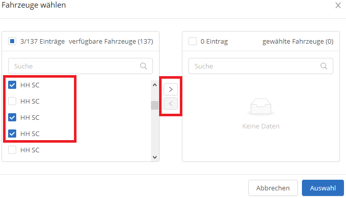 In der sich öffnenden Liste können Sie die Fahrzeuge, die Sie auswählen möchten, anklicken. Ausgewählte Fahrzeuge werden durch ein Häkchen markiert. Anschließend können Sie die Pfeile nutzen, um die ausgewählten Fahrzeuge zur Auswahl hinzuzufügen oder wieder zu entfernen. Bestätigen Sie Ihre Auswahl, indem Sie auf den - Button klicken.
