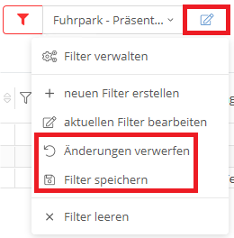 Wenn Sie die vorgenommenen Änderungen am Filter speichern möchten, klicken Sie auf das Bleistift-Symbol rechts neben dem Auswahlfeld und anschließend auf Filter speichern.