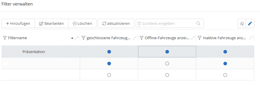 In der sich öffnenden Ansicht sehen Sie eine Tabelle. Diese zeigt an, welche Fahrzeuge unter den jeweiligen Filtern angezeigt werden (archiviert/ geschlossen, offline oder inaktiv). Über die Funktionsleiste können Sie Filter hinzufügen, bearbeiten oder löschen.