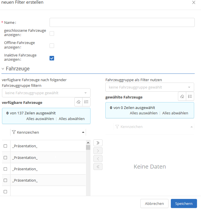 In der sich öffnenden Eingabemaske können Sie einen Namen für den Filter festlegen, bestimmen welcher Fahrzeugtyp zusätzlich zu den aktiven Online-Fahrzeugen angezeigt werden soll und einzelne Fahrzeuge oder Fahrzeuggruppen zur Auswahl hinzufügen.